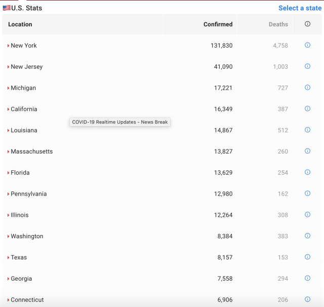 其中纽约州累计确诊131830例,死亡4758例;新泽西州累计确诊病例41090例,死亡1003例。