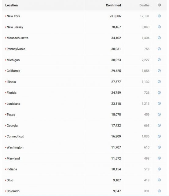 其中纽约州累计确诊231086例,死亡17131例;新泽西州累计确诊病例78467例,死亡3840例;康涅狄格州累计确诊病例16809例,死亡1036例。