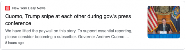 8. 在记者会期间,总统川普发布推特表示:“库默州长应该多花点时间做,少花点时间抱怨。我们为你建造了数千张你不需要或不使用的病床,提供了大量本应配备的呼吸机,并帮助你进行了本应进行的测试。到目前为止,我们给纽约的钱、帮助和设备比任何其他州都要多得多,但大家从来没听你说谢谢。”州长库默也在现场对此进行了回应,他表示:联邦之前给了纽约很多病床,呼吸机,但是纽约现在已经不需要了,原因是相信了白宫和CDC“有出入”的数字和预测。他还说自己对于总统川普做的很多事都表达过感谢,但他认为总统做的这些还远远不够。
