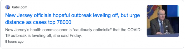 据侨报纽约网报道,新州17日周五公布的最近疫情数字,新冠确认人数达到了78,647人,死亡人数达到3840例。在过去的24小时内,新增确诊3250例,新增死亡323例。