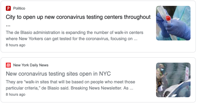 纽约市设立了新冠病毒“无需预约”(Walk-in)社区检测点,最初的周检测量为2400人。周五开放的社区检测点包括:位于布鲁克林东纽约的哥谭医院、位于布朗士莫里萨尼亚的哥谭医院和位于史丹顿岛克里夫顿的范德堡健康中心。下周一开放的社区检测点为:位于曼哈顿哈林区的Sydenham家庭健康中心和位于皇后区牙买加的皇后医院。