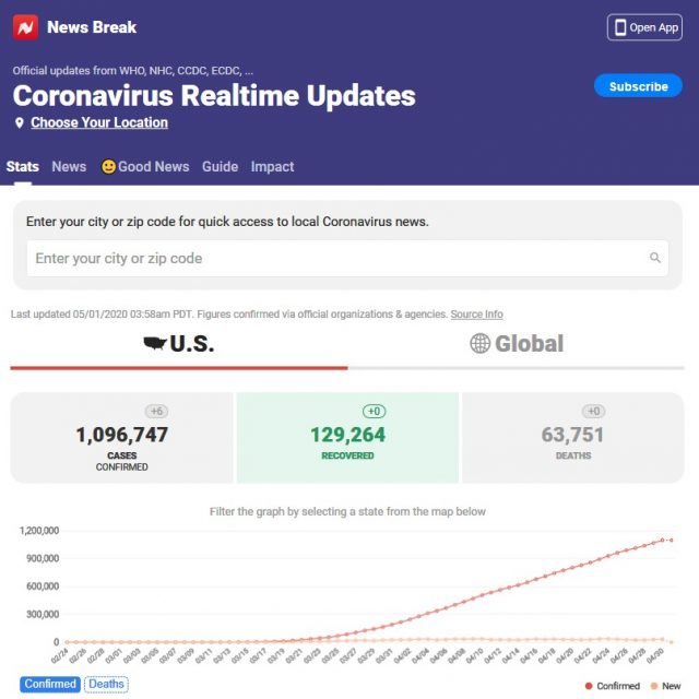 据News Break报道,根据WHO、NHC、CCDC、ECDC等官方数据,截止美国东部时间5月1日凌晨3:58,美国新冠累计确诊1096747例,死亡63751例,康复129264例。