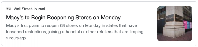 据amny报道,美国销售额最大的百货商店运营商、总部位于俄亥俄州辛辛那提(Cincinnati)的梅西百货说,如果感染率如预计的那样逐渐下降,且州政府和地方政府允许的话,预计其约775家门店将在六周内全部重新开业。下一批约50家门店将于5月11日重新开业。