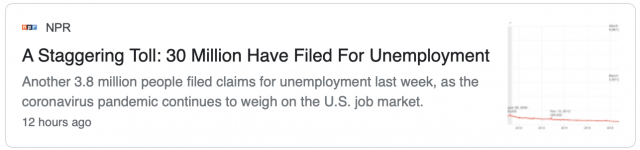《今日美国》说,在过去的六周中,约有三千万美国人申请失业救济,这一严峻的迹象表明,新型冠状病毒大流行疫情严重削弱了美国经济。