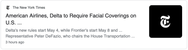 美联航也将于下周一开始要求旅客戴口罩。美国航空的政策将于5月11日生效。Frontier航空发布了一项类似的要求,该要求将于5月8日生效。本周早些时候,JetBlue率先公布口罩政策,是第一个有此要求的美国主要航空公司。