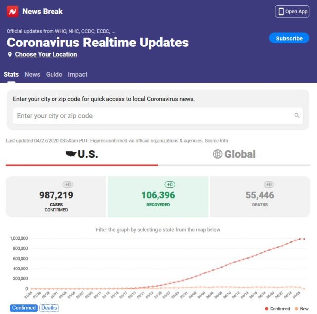 据News Break报道,根据WHO、NHC、CCDC、ECDC等官方数据,截止美国东部时间4月27日凌晨3:50,美国新冠累计确诊987219例,死亡55446例,康复106396例。