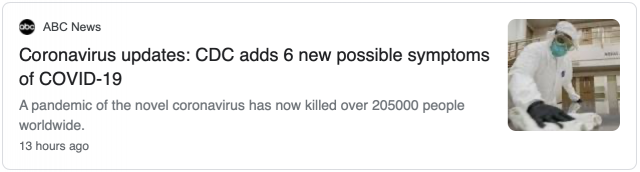 据abc7ny报道,周日(4月26日)美国疾病控制与预防中心补充了可能出现的新冠感染症状:发冷,寒颤发抖(Repeated shaking with chills),肌肉疼痛,头疼,咽喉痛,丧失味觉或嗅觉。