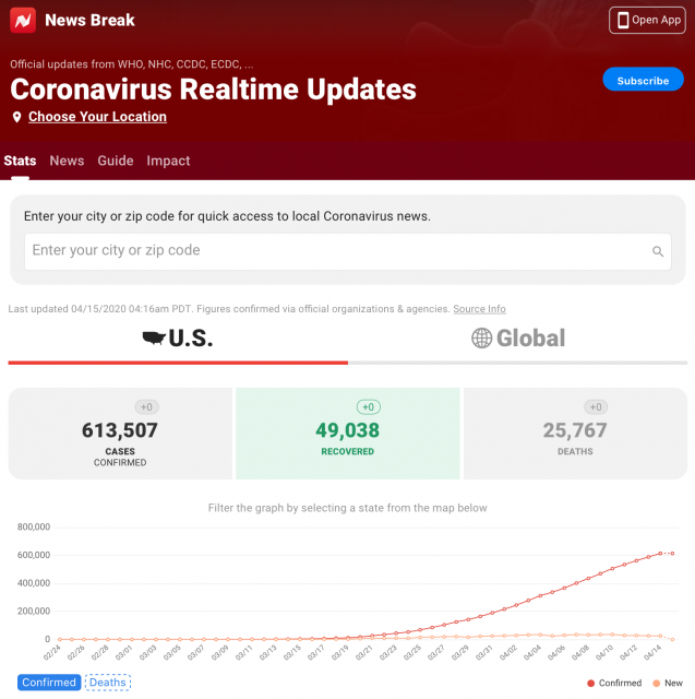 据News Break报道,根据WHO、NHC、CCDC、ECDC等官方数据,截止美国东部时间4月15日凌晨4:16,美国新冠累计确诊61350例,死亡25767例,康复49038例。