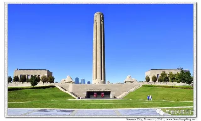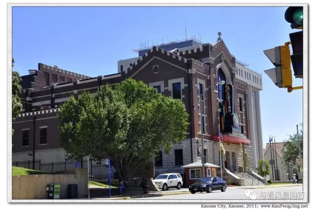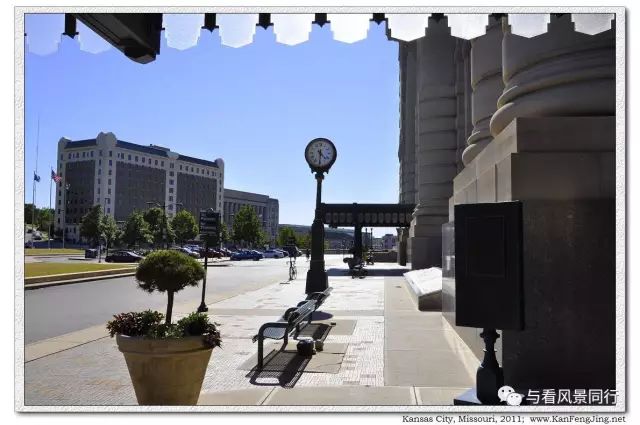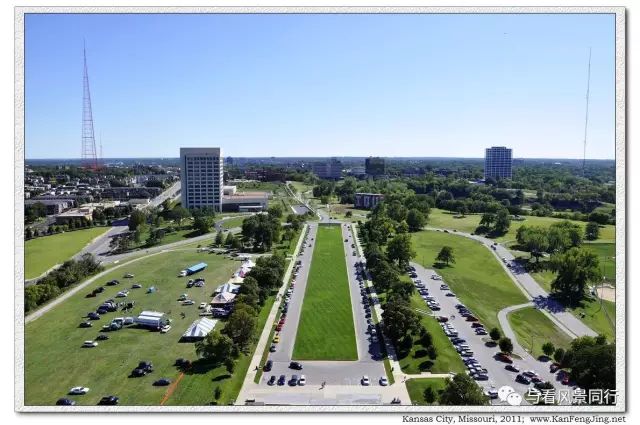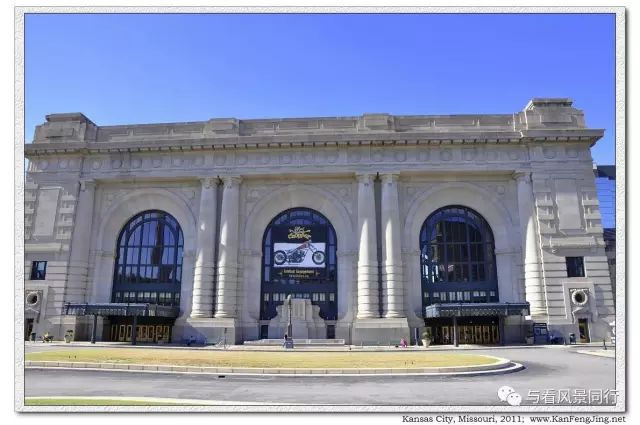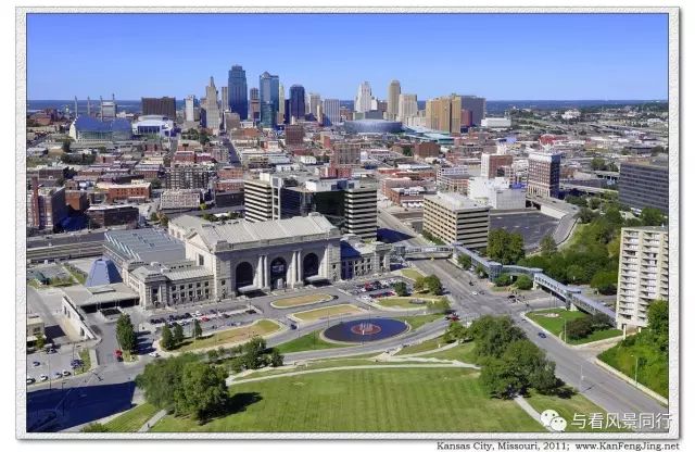 11. 密苏里州的堪萨斯城,现代化的城市,近景是联合车站,左侧的两个圆形建筑物是新建成的艺术演出中心