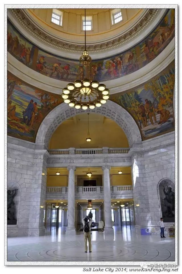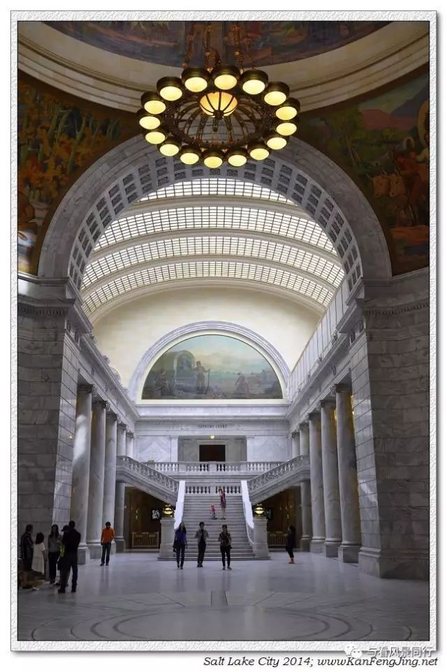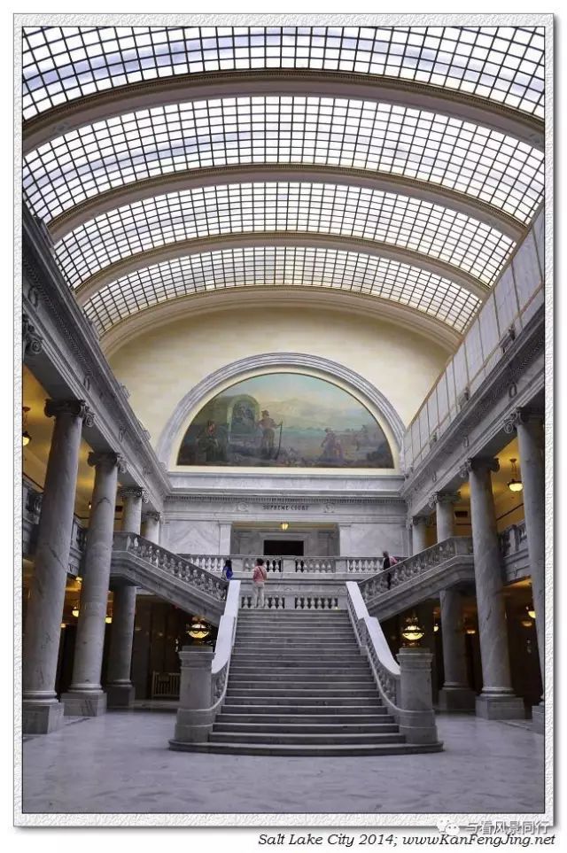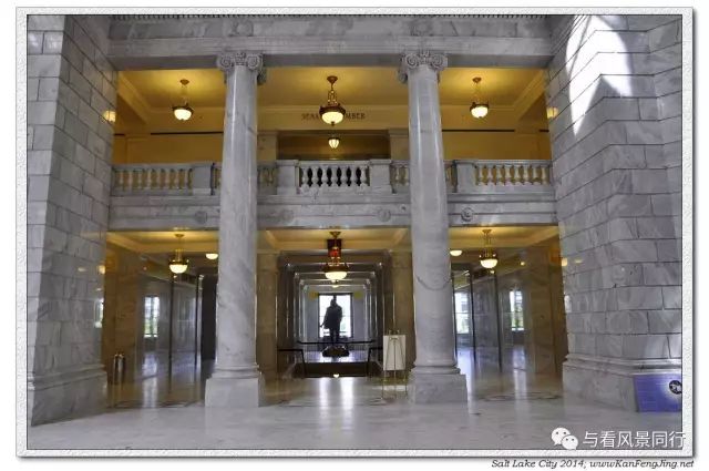 美国很多州的州府大厦都是华盛顿国会大厦的各色各样山寨版。而犹他州的州府大厦,算是山寨的外形最像的。不仅建筑外形像,地形也像,也是位于一座小山丘的顶端。厚重的石头墙里面,非常的厚重简朴,基本没有任何稍显奢侈的装饰。处处充满了简朴淳厚的设计风格。