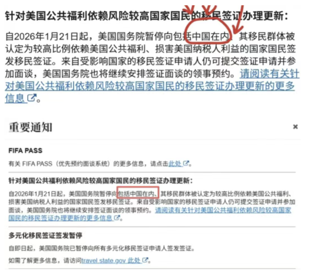 截图显示:美国将从 2026 年 1 月 21 日起,暂停向包括中国在内的“福利依赖风险高”的国家发放移民签证。