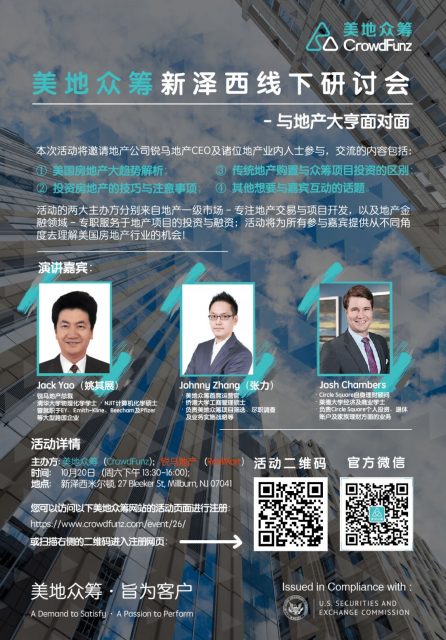 美地众筹将于10月20日(周六),下午1:30至4:00,在新泽西蜜尔本市(Millburn)举行新泽西线下交流研讨会,届时欢迎各位身处美东的客户、潜在投资者或来自不同行业并对地产投资感兴趣的朋友参与!