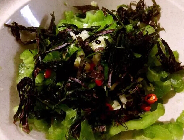 然后将紫苏切成丝状,再两颗配上朝天椒、蒜蓉,与切好的苦瓜相拌。