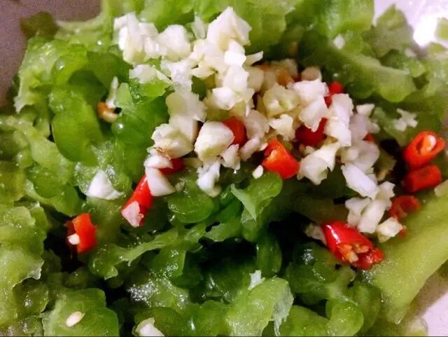 然后将紫苏切成丝状,再两颗配上朝天椒、蒜蓉,与切好的苦瓜相拌。