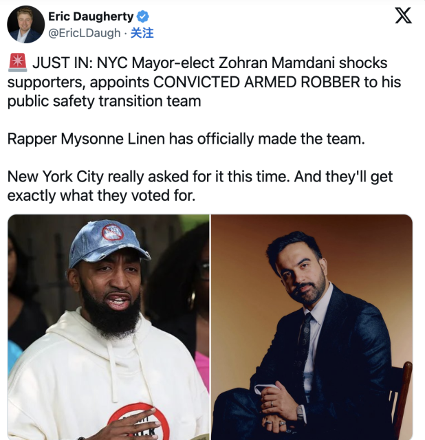 知名亲特朗普媒体人埃里克·多尔蒂在X网站上发帖称:“纽约市当选市长佐兰·马姆达尼任命一名曾因持械抢劫被定罪的罪犯进入其公共安全过渡团队,此举震惊了支持者。说唱歌手迈索恩·莱宁正式入选。纽约市这次真是咎由自取。他们将会得到他们投票选择的结果。”