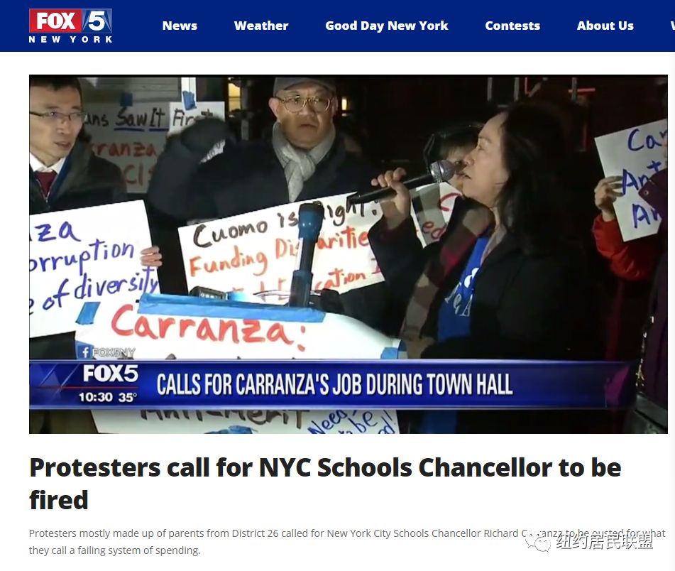 亚裔家长在6点15分,在会场外举行了示威抗议,要求炒掉教育局长卡烂渣,FOX5 NewYork福克斯电视台报道了