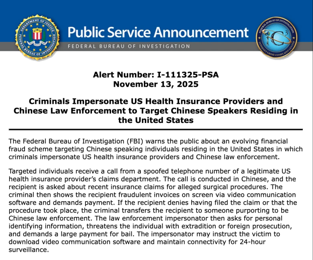 美国联邦调查局(FBI)近日发布公共服务公告,警示居住在美国的华语人士正成为诈骗分子的新目标。这些犯罪分子精心设计骗局,冒充美国医疗保险公司和中国执法人员,诱骗受害者泄露个人身份信息并支付巨额款项。