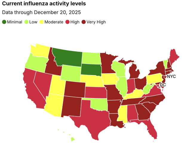 CDC指出,目前已有21个州的流感传播水平达到“非常高”。其中,纽约市、纽约州、新泽西州、南卡罗来纳州、路易斯安那州和科罗拉多州的传播率居于全国前列。