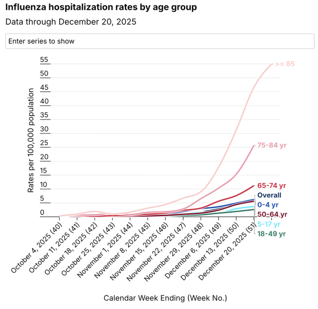 美国疾病控制与预防中心(CDC)公布的最新数据显示,截至12月20日当周,全国流感检测阳性病例较前一周暴涨53%,比去年同期高出近75%。同期,流感相关住院人数激增51%,与去年相比几乎翻倍。