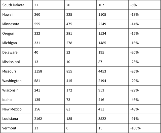 并非所有州都经历了扒窃案件的增长。报告显示,路易斯安那州(-91%)、新墨西哥州(-48%)和佛蒙特州(-100%)等州的扒窃案件报告数量在同一时期出现了显著下降。