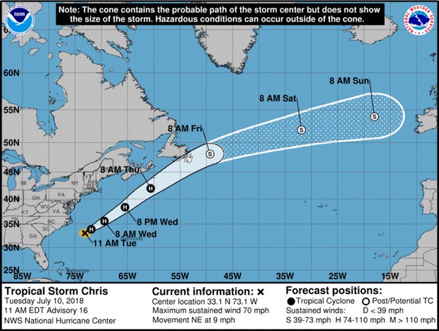 在上午11点的更新中,国家飓风中心表示克里斯保持同样的力量,最高风速为70英里/小时,风暴继续向东北方向移动。