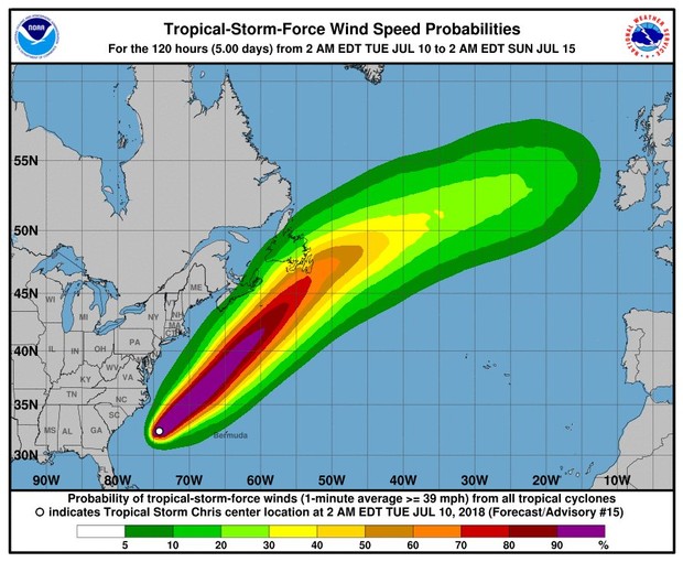 据国家飓风中心的预报员说,热带风暴克里斯在大西洋洋面上形成以来,在过去的24小时里发生了很少的变动,逐渐加强,现已成为2018年大西洋飓风季节相对缓慢的第二次飓风,预计将在星期二晚些时候在北卡洋面北部继续向北移动,周三早些时候会抵达新泽西附近洋面。