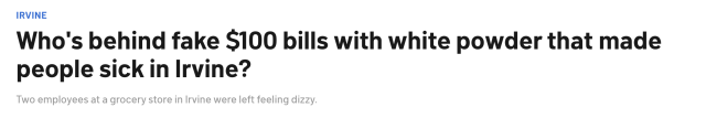 一张看似普通的100美元钞票,却让超市员工当场头晕送医。近日,在南加州华人聚居城市Irvine发生一起令人不安的事件:一家超市内接连发现夹带白色粉末的假钞,两名员工在接触后身体不适,引发警方与消防部门紧急介入调查。