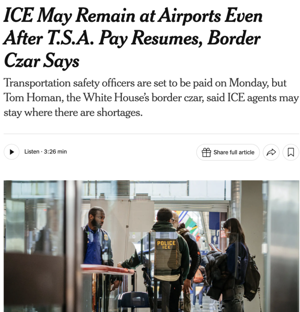 白宫边境事务负责人公开表示,即便TSA员工恢复发薪,ICE是否撤离机场,还要看实际人手是否恢复。换句话说,只要人不够,这些“临时工”就可能变成“长期驻场”。