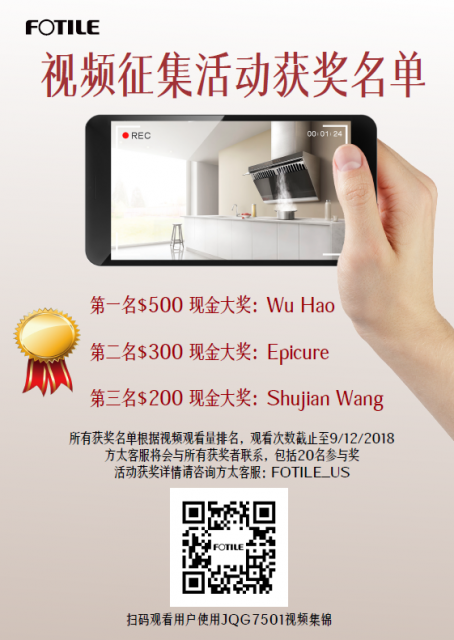 由于本次活动评选是按照观看量排名,有些顾客很遗憾因为提交视频时间太晚并没有获得大奖,但是为了表示对这些观众拍摄素材的高质量的肯定,我们将会随机抽取20名参与奖给予这些参赛者。方太美国也非常感谢各位对本次活动的支持,也敬请保持对我们的关注,之后的新品也会有视频征集活动,说不定下次的幸运儿就是你!