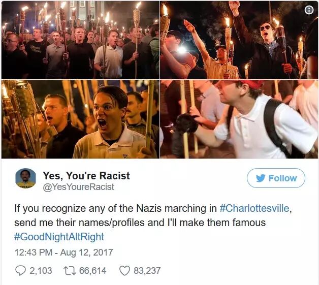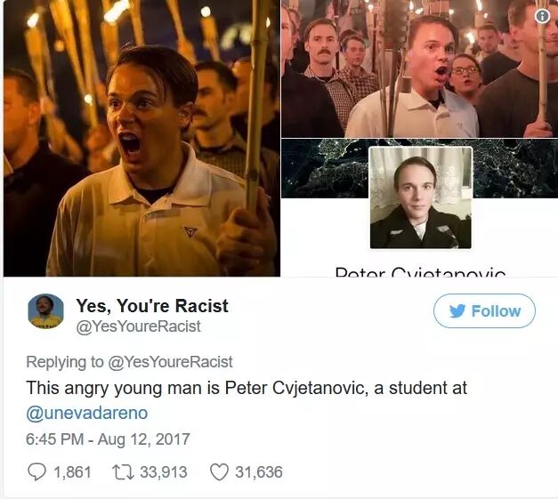 一些推特用户在推特里煽动群众,人肉参加白人至上游行的人。于是乎,20岁的内华达大学学生彼得·切夫塔诺维奇(Peter Cvjetanovic)就被人肉出来了。 他上周五参加在弗吉尼亚大学白人民族主义的游行时被人拍了下来,他的照片还被登在了很多媒体网站上。