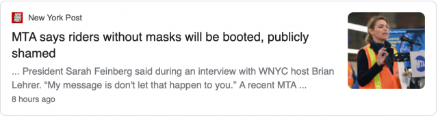 根据《纽约邮报》的报道,MTA 纽约市公交局临时局长芬妮博格(Sarah Feinberg)表示,当不戴口罩的人乘坐地铁或巴士时,所有乘客都会看着他们,有的人会拍照,大家开始盯着看,你马上会觉很难为情。芬妮博格说,她之所以要说出来,就像希望这种情况不会发生在你身上。