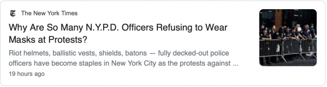 据《纽约邮报》报道,当被媒体问及在几周内拍摄的大量照片中,警察都未佩戴口罩时,警察局新闻办公室在一份声明中表示,“也许是太热了,因为警员们是在阳光下要穿着15个小时的防弹背心。”