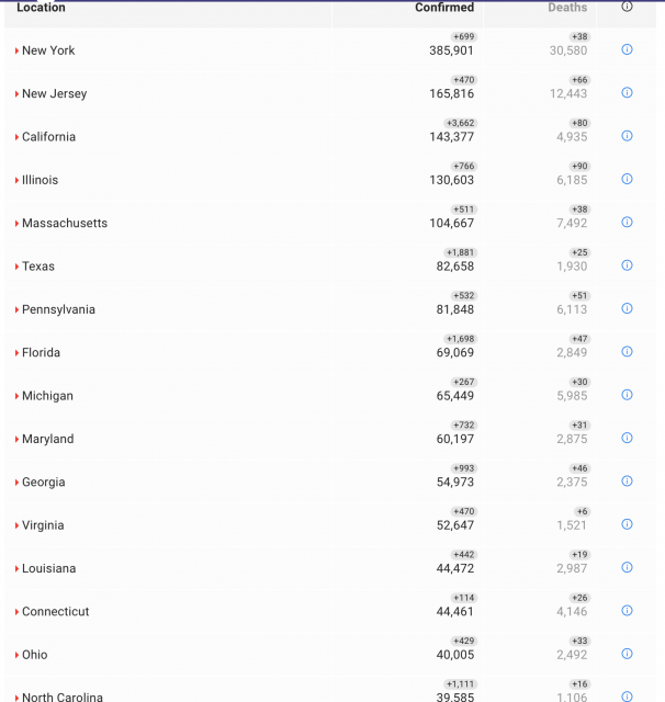 其中纽约州累计确诊385901例,死亡30580例;新泽西州累计确诊病例165816例,死亡12443例;康涅狄格州累计确诊病例44461例,死亡4146例;宾夕法尼亚州累计确诊病例81848例,死亡6113例。