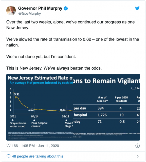 据侨报纽约网报道,新泽西州州长墨菲周四(6月11日)在疫情发布会上表示,新泽西州抗疫进入第100天,感谢民众的理解和支持,新泽西州将在下周一(6月15日)顺利进入重启第二阶段。