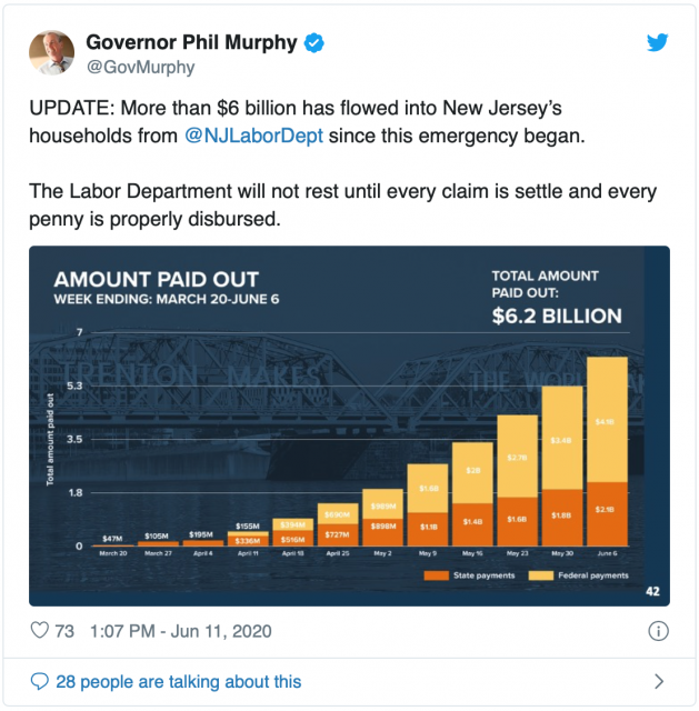 墨菲还表示,新型冠状病毒肺炎疫情在新泽西州爆发以来,新泽西州劳工厅已经发放了62亿美元的失业救济金,94%申请失业救济金的民众每周都已经在领失业救济金。