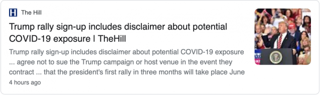 川普的竞选团队周四正式宣布,总统3个月以来的首次集会将于6月19日在俄州塔尔萨(Tulsa)举行。民众注册这场免费集会门票时,包含了一份与新冠病毒有关的免责声明。