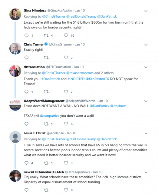 特朗普表示,派特里克的这一建议“非常有趣,我喜欢这个主意”,但是,部分德州老百姓不干了。咦,不是说好的让墨西哥出钱的吗?