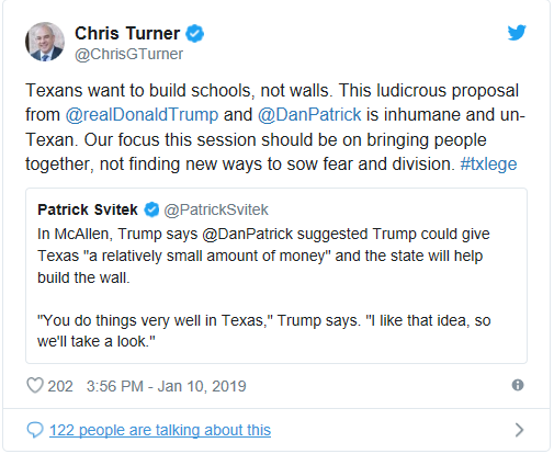 特朗普称,派特里克告诉他,“给德州相对少一些的拨款,让德州自己来建墙,因为德州人想要这堵墙。”特朗普认为“德州人做事很棒,我喜欢,我会考虑这个建议。”