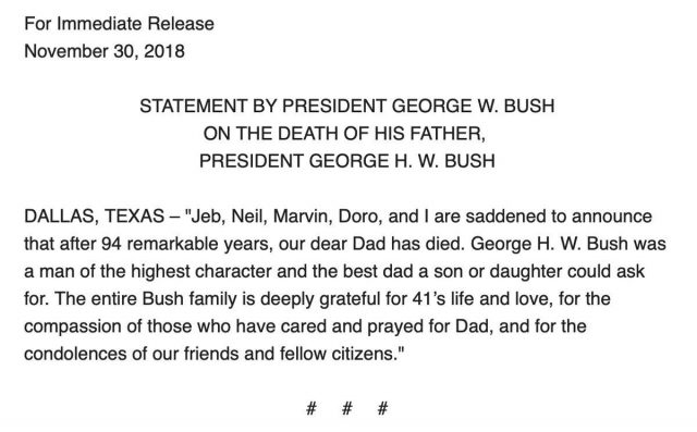 “遗憾宣布:我们亲爱的父亲经过非凡卓越的94年岁月后去世了。乔治·赫伯特·沃克·布什是一位拥有最高尚品格的男人,也是作为儿女可以拥有的最好的父亲。 我们整个布什家庭都非常感激那些曾关心和为父亲祈祷的人们,感谢我们的朋友和同胞们的哀悼。”