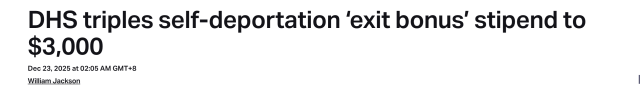 美国国土安全部(DHS)近日宣布,将自愿遣返的“离境奖励”从此前的 1000 美元 提高至 3000 美元,整整翻了三倍。该优惠仅在 12 月 31 日前有效,适用于在年底前完成登记并离境的无证移民。