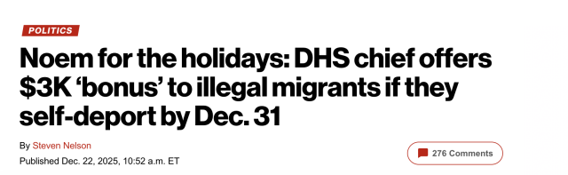 在移民执法持续加码的背景下,美国政府在年末抛出一项极具争议的“胡萝卜加大棒”政策——对自愿离境的非法移民发放最高 3000 美元现金奖励,并提供免费返程机票。这项被称为“回家过节”的特别计划,被外界形容为美国版的“圣诞补贴”。