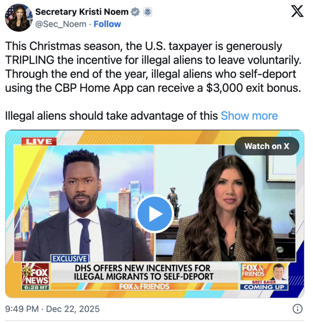 诺姆还在社交媒体和福克斯新闻上多次敦促无合法身份者使用 CBP Home 应用,并直言:“这里是过节的家。我们会给你买机票,给你 3000 美元,送你回家过圣诞节。”
