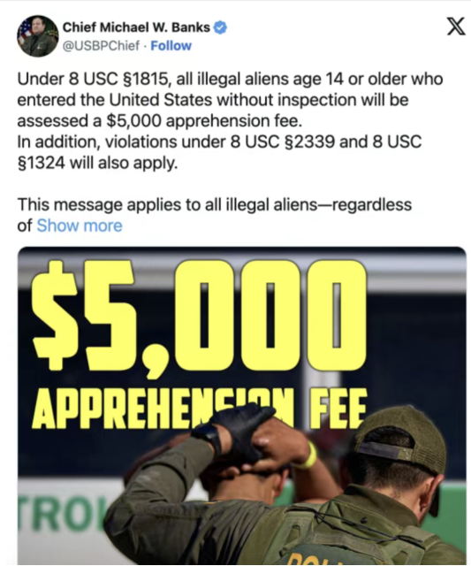 就在不久前,政策风向还截然相反。12 月初,美国边境巡逻队队长迈克尔·班克斯宣布,根据特朗普政府 7 月签署生效的《一项宏伟法案》(One Big Beautiful Bill Act),14 岁及以上未经检查入境的非法移民,一旦被捕将面临 5000 美元罚款。