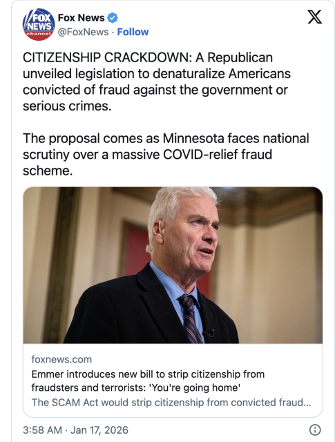 埃默反复强调,SCAM 法案传递的信息“没有缓冲,也不存在误解空间”。“这项立法不仅是为了追究明尼苏达州索马里诈骗犯的责任,更重要的是,恢复美国入籍制度长期以来应有的诚信,”他说,“如果你靠欺诈和犯罪拿到身份,那这个身份本身就是无效的。是时候把他们遣送回国了。”