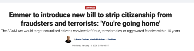 美国国会共和党人正酝酿一项影响深远的新立法。众议院多数党党鞭、明尼苏达州共和党众议员汤姆·埃默(Tom Emmer)即将提出一项名为《停止滥用公民身份和虚假陈述法案》(Stop Citizenship Abuse and Misrepresentation Act,简称 SCAM 法案)的议案,直指入籍美国后的犯罪问题,尤其是欺诈与恐怖主义相关犯罪。