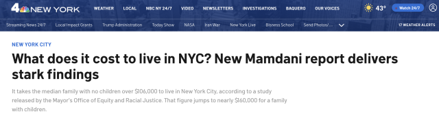 由市长佐兰·马姆达尼推动发布的《真实生活成本(TCOL)》报告显示,在纽约,没有子女的家庭年收入中位数需要超过10.6万美元,才能维持基本生活;而一旦有孩子,这一数字迅速飙升至接近16万美元。换句话说,普通家庭如果达不到这个收入水平,很可能连“基本体面生活”都难以维持。