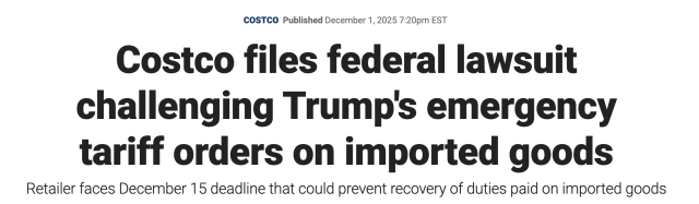 “这是对我们法律体系的直接挑战,”乔治城大学贸易法专家马克·布施评论道,“Costco的加入标志着这场斗争进入了新阶段。长期以来,挑战关税的主力是中小企业,现在,真正的巨头下场了。”