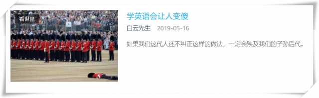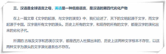 没错,这篇题目就叫做《学英语让人变傻》,文章里说,汉语是全球,全球的母语,英语是低级语言,是汉语的劣化产物?