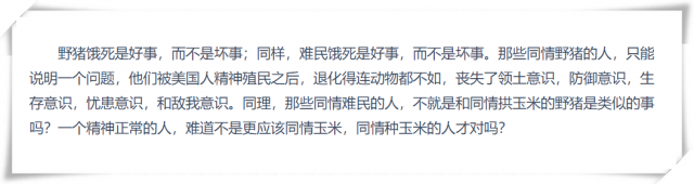 同理,谁同情难民,谁就禽兽不如,是被美帝精神殖民的卖国贼。
