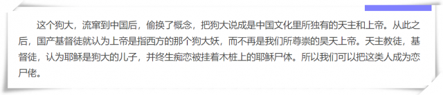 比如说外国、外民族都是劣等禽兽,只有我们才是全世界唯一真神,早晚把他们消灭。